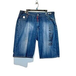 Vintage Y2K Blanco Label denim shorts featuring a large embroidered back pocket design with colorful crest details and logo patch on the waistband. Classic early-2000s hip-hop style with a relaxed, long fit.