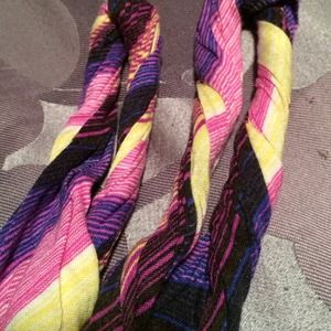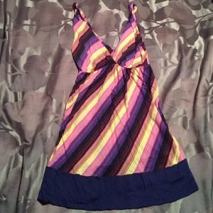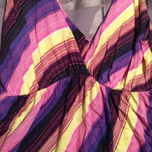 Pretty diagonal striped top (purple pink and yellow color scheme) with twisted straps. V cut in front and back.