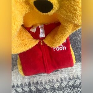 Cozy Disney onesie featuring Winnie the Pooh. Bright red and yellow design. Ideal for lounging.