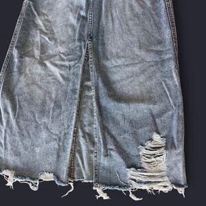 distressed denim, high rise, midi skirt, grunge style, faded wash, vintage vibe, retro fashion, baggy fit, raw hem, casual edgy