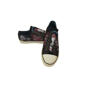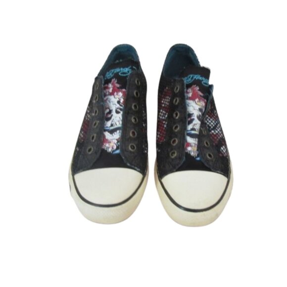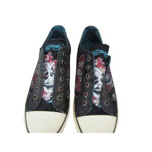 These Ed Hardy sneakers embody bold Y2K aesthetics with a striking skull graphic and fishnet overlay. Designed for comfortable, casual wear with a slip-on style. Y2K sneakers with nice graphics. Some light scuffing noted. Please see the photos. In size 10.