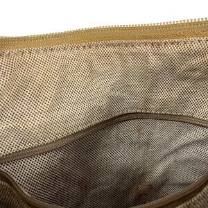 Pretty clean. Signs of wear on bottom corners of canvas. Signs of makeup in small zipper pocket inside. Interior fabric has discoloration from use; more of a beige than a gray in some areas. The trim on the leather handles are peeling. Hardware has some scratches. Width: 10", Height: 7.5", Depth: 4", Strap drop: 10".