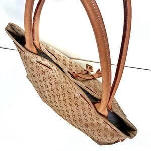 Y2K Dooney and Bourke shoulder bag, vintage Dooney canvas tote, monogram jacquard bag, beige logo bag with leather trim, early 2000s Dooney purse, double handle satchel, tan leather Dooney bag, dooney and bourke tassel bag, structured vintage tote, preppy canvas shoulder bag, neutral Dooney Bourke handbag, vintage coach bag, vintage coach, y2k coach, logomania, vintage dooney canvas tote, durable toe bag, american heritage fashion