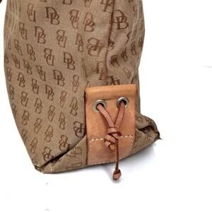 A true early-2000s classic from Dooney & Bourke — this monogram canvas shoulder bag blends preppy heritage with Y2K-era detailing. Beige jacquard exterior with tonal D&B monogram throughout, trimmed in smooth tan leather. Features dual shoulder straps, leather corner patches with embossed logos, and a tassel-accented front for a signature vintage look.