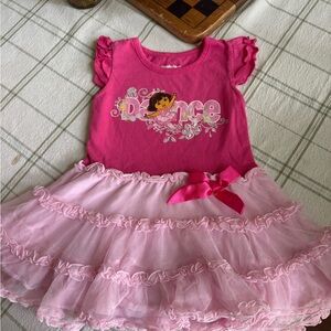 Adorable pink dance dress featuring a ruffled skirt and cute character design. Perfect for little dancers.