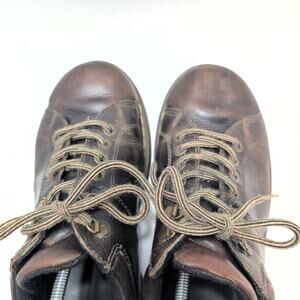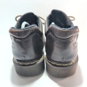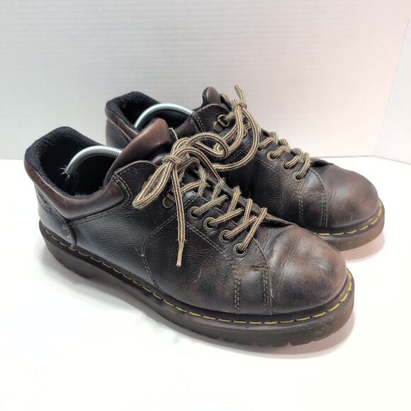 These vintage Dr. Martens capture the heavy, grounded aesthetic of late 90s and early 2000s streetwear. Crafted from a rich, dark cocoa brown leather with a natural grain, these shoes feature a robust chunky platform and the iconic yellow welt stitching that defines the brand's DNA. The silhouette is anchored by a thick, translucent air-cushioned sole that provides a substantial lift and a solid, weighted feel with every step. Subtle design details like the metal eyelets and reinforced stitching across the toe box give them a rugged, industrial edge that stands out from standard footwear.