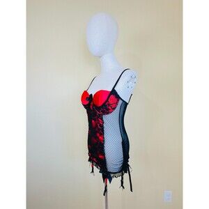 Sexy little Dreamgirl bustier teddy! Red satin fabric peeks out from beneath gorgeous black lace. Attached garter belt and darling ribbon bows. Adorable ruching on the sides. Sheer back. My favorite part is that it pulls on over the head!