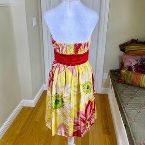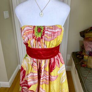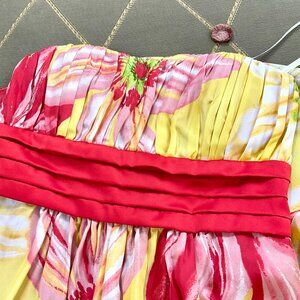 Really beautiful high quality silk strapless dress, 00s or 90s, pleated bust and waist, strapless, back zip, yellow red green multicolored floral sunflowers, beautiful