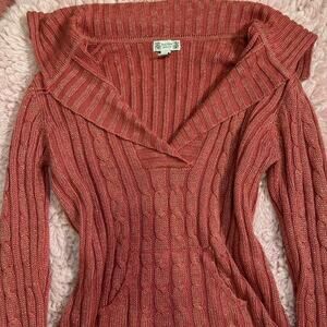 duck head coral sweater with gold metallic threading! has a vneck neckline perfect layering piece. so soft and cozy! size xl ptp 19-27”