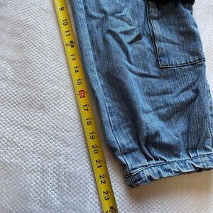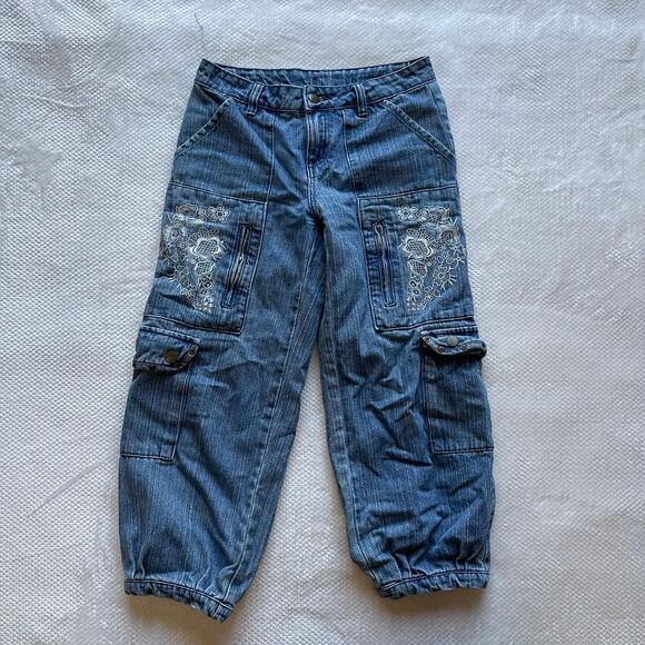 🍯 - Blue denim cargo capris with elastic cuffs, floral white embroidery on pockets, multiple snap pockets, and a classic Y2K streetwear vibe