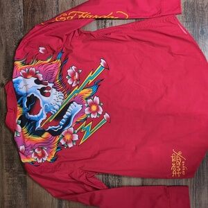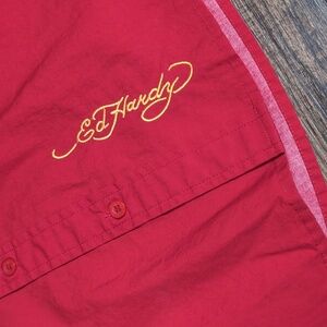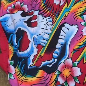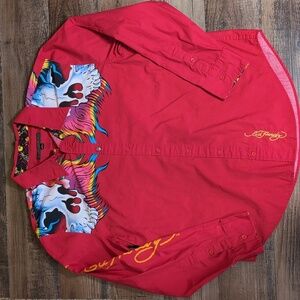 Y2K Ed Hardy Classic Button Down Flip Cuff Shirt Size XXL In Red Floral Skulls