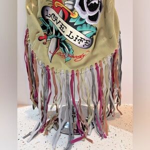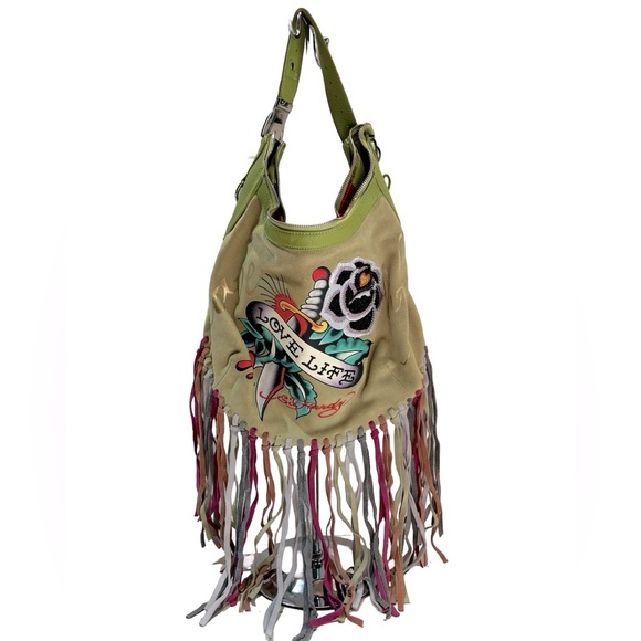 Vintage Y2K Ed Hardy LOVE LIFE Green Leather Suede Fringe Shoulder Handbag with Crystal Rose