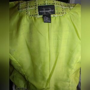 This stunning chartreuse tweed jacket is crafted for a sophisticated wardrobe. Designed by Requirements, it features a fully lined interior for ultimate comfort and is made from 100% polyester. Its size 12 fit makes it a perfect choice for both work and social occasions. The clean, structured design is elevated by black trim details, adding a modern touch to its classic style.