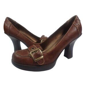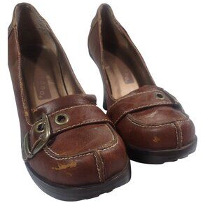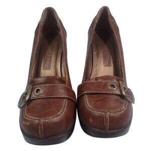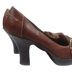 Y2K Ellemenno Chunky Heel Big Buckle Faux Leather Brown Heels Office Siren 7.5M