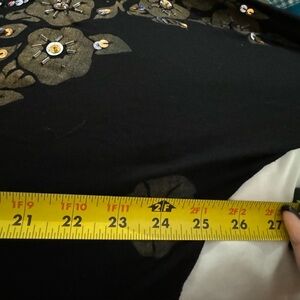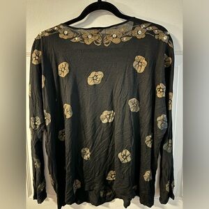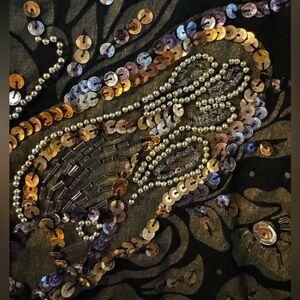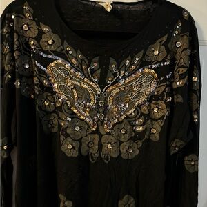Y2K Embellished Beaded Butterfly Sparkle Black Floral Women's Top One Size Vintage. Elegant black top featuring intricate floral embellishments. A few loose sparkles on the sleeve but otherwise in nice vintage condition. Light weight Rayon, Bali Chic, labeled All/one size. Best for small to slim large depending on how loose/tight you want it to fit.