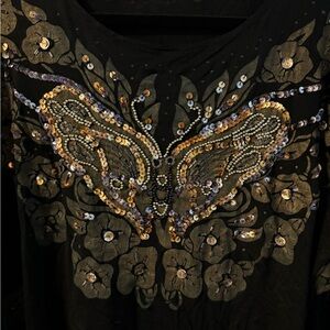 Y2K Embellished Beaded Butterfly Sparkle Black Floral Women's Top One Size VTG