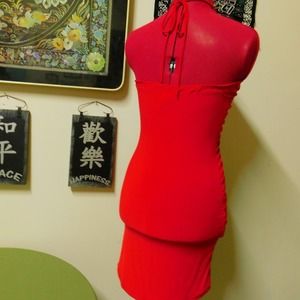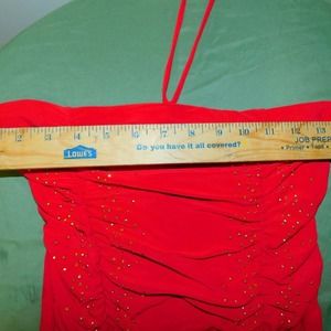 Y2K Entry red drape rouching dress Micro Mini gold studs and rouched details on sides & front Has waterfall rouching on front. ties around neck