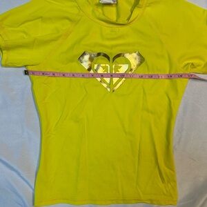 Bright yellow tee featuring a gold heart logo. Perfect for a fun style.
