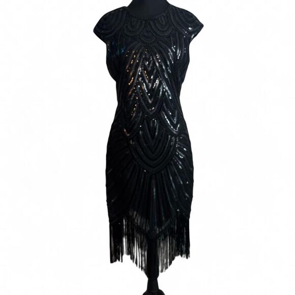 Y2K Era Style Black Beaded Sequin Fringe Flapper Dress - Art Deco Goth Glam - Medium