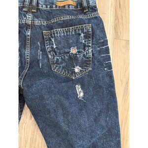 Y2K Evolution In Design Distressed Denim Shorts 38 Patches Frayed Hip Hop Skater