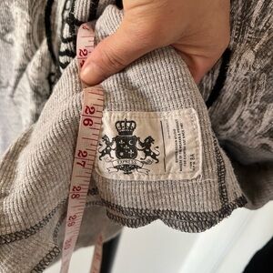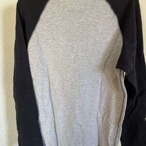 This Express long sleeve tee features a striking black and gray color combination with a bold crest design on the front. The shirt's raglan style and comfortable fit make it perfect for casual wear, while the vintage-inspired emblem adds a touch of rock-and-roll flair.