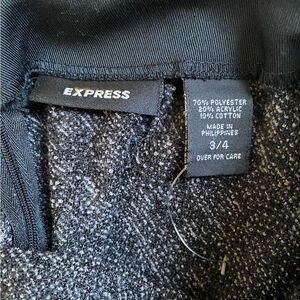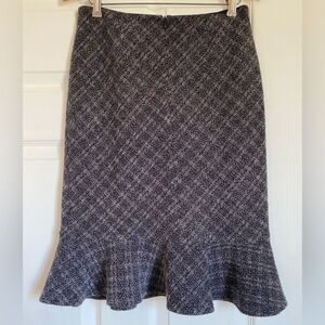 This sophisticated midi skirt from Express features a classic black and white design, perfect for work or cocktail occasions. The trumpet style with ruffled hem adds a playful touch, while the structured fabric ensures a flattering fit.