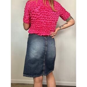 Super fun Y2K denim skirt with sassy front slit. 100% cotton so a little stretch but not much.