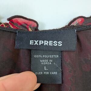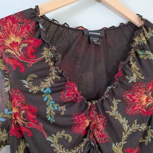 Floral Mesh Vintage 90s Y2K Ruffle Top by Express - Size Large - Brown, Blue, Green & Red