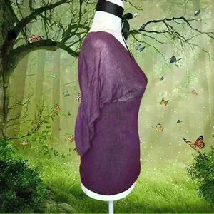 Gorgeous purple Y2K express top, crossover, 3/4 sleeve with scrunch detailing, waist is not see through and it snatches your waist!, comfortable and breathable material, purple, upper body is 100% Nylon, Lower Portion is 80% Rayon, 17% Nylon