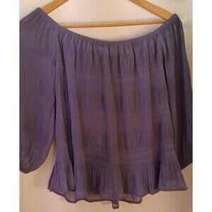 Y2K Express Purple Smocked Off Shoulder Peplum Blouse Size Small, Stretchy Smocked Fabric, Sheer Sleeves, Lined Bodice