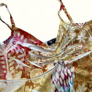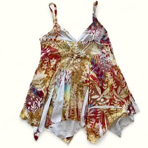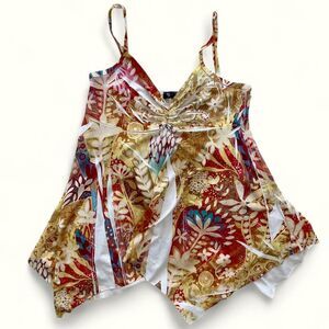 Vintage 2000s Y2K White and multi-coloured fairycore cami top with vibrant tie dye effect floral print and asymmetric fairy hem