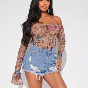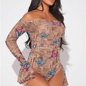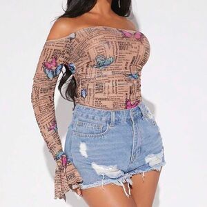 Y2K Fairycore Barbiecore Nude Mesh Butterfly Flare Sleeves Bodysuit