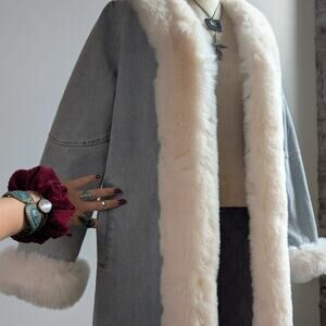 Y2K Faux Fur Penny Lane Coat Acid Wash Denim Trench Coat Afghan Jacket Medium