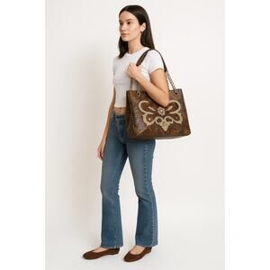 For the baddie who haunts gas stations, thrift stores, and dive bars in the same day. This vintage faux leather tote is giving peak Y2K with metallic snakeskin texture, dual chain + faux leather straps, and glittering floral appliqué with rhinestones and cutouts. Medium size with magnetic snap closure and satin gold interior with zipper pocket. Unbranded but iconic. A little outrageous, a little nostalgic — just like you.