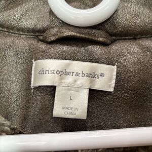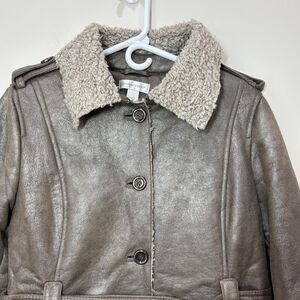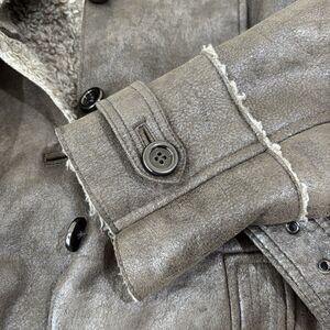 Features: Vintage Christopher & Banks Faux Suede Sherpa Lined Coat. Beige Brown with a subtle metallic sheen. Belted. Mid length. Shoulder button details. Trench style