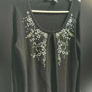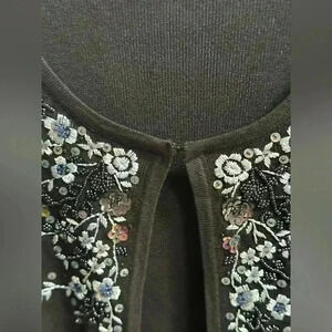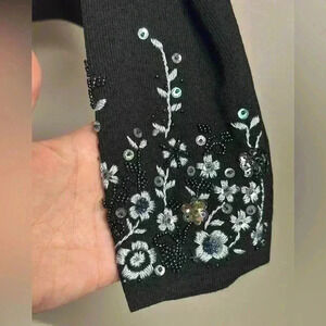 Stunning Y2K Finity cardigan-style sweater featuring intricate embroidery, beading, and sequins in a floral design across the front. The soft black knit is beautifully contrasted with blue and white florals, and the front clasp closure adds a touch of vintage elegance. Perfect for layering or wearing solo as a statement piece. In excellent, like-new condition—no missing beads or sequins, no flaws.
