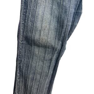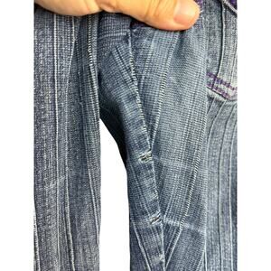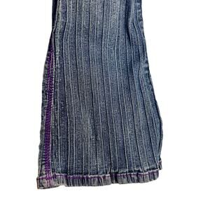 Vanilla star brand y2k / 90's flare jeans in US juniors size 11. See measurements. Bright purple thread detail along sides, pockets and belt area. Stretchy with ribbed detail. Some ware and thread pulls on ribbing between legs. Possible light stain on right knee, its so light i can't tell if stain or just the distressed look of jeans. If outside of US message for exact pricing. I will combine shipping on multiple orders just message me before purchasing. Measurements are all approximate flat measurements taken in inches.