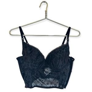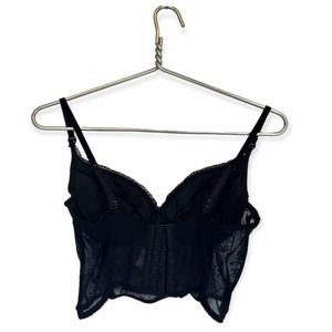 Black colored, sleeveless, tank top from the early 2000’s brand Secret Treasures, with a hook and eye closure, adjustable straps, floral mesh construction, and lace lining the cups. Size 36B. Light padding in the cups.