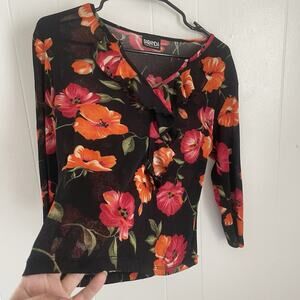 Gorgeous Y2K-era sheer mesh top with a bold floral print and cascading ruffle front. The lightweight, stretchy fabric and romantic color palette give it a whimsigoth-meets-early-aughts feel. No size tag, fits like a medium based on measurements. Fading and general wear throughout, consistent with age.