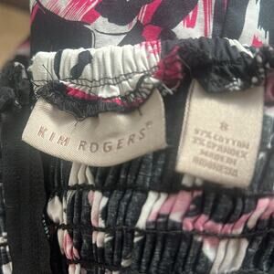 Brighten up your summer wardrobe with this vibrant Kim Rogers sundress in a flattering fit & flare silhouette. Featuring a bold black, white, and magenta floral print, this sleeveless dress has a surplice V-neckline with contrast black trim and white stitching. The empire waist and stretchy smocked back offer a comfortable, flexible fit.
