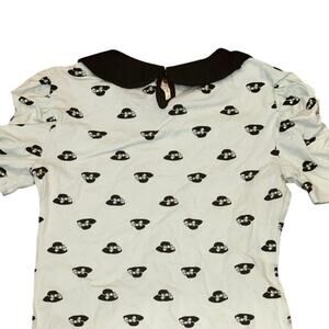 Authentic early 2000s Forever 21 top in a mint green shade with a bold black cartoon face print throughout. Made from a stretchy cotton and spandex blend. Features puffed short sleeves, a black Peter Pan collar, and a back keyhole with button closure.