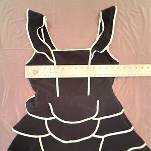 Chic black mini dress with white trim. Features layered ruffle design. Perfect for a night out.
