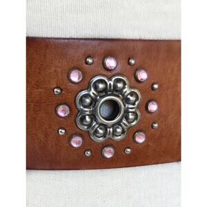Y2K Fossil Brown Leather Belt M Floral Medallion Pink Crystal Glam