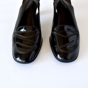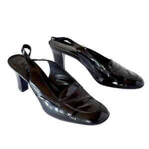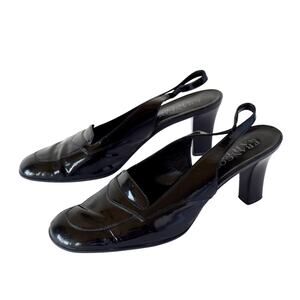 Vintage Franco Sarto slingback heels in black patent leather. These elegant heels feature a comfortable 3-inch block heel and are made with a leather upper and man-made sole.