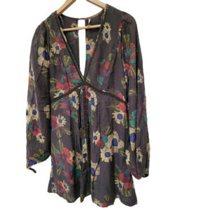 Y2K Free People deep v-neck long balloon sleeve mini floral print retro dress