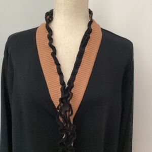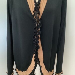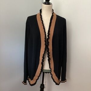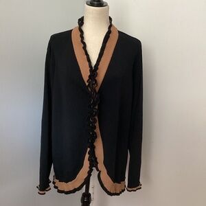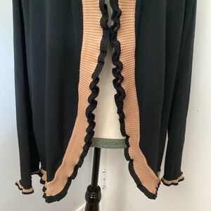 Y2K GRACE DANE LEWIS PLUS 2X BLACK KNIT CARDIGAN OPEN FRONT BEIGE RUFFLE TRIM