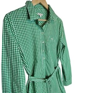 Stylish green checkered long sleeve button down shirt dress with a tie waist. Perfect for casual outings.