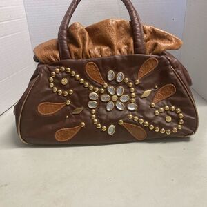 Y2K Genuine Leather Rhinestone Handbag Satchel brown & tan Baguette Chunky