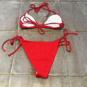 Stylish red bikini set with halter top and tie-side bottoms. Perfect for the beach.