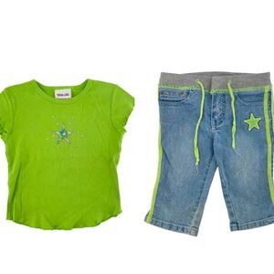 Y2K Girls 2-Piece Outfit – Green Embellished Tee & Denim Striped Capris, Size 4